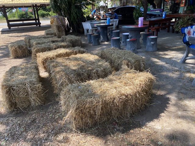 外には干し草のベンチや机もありました。