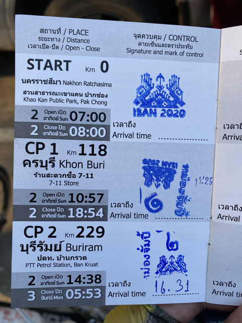 そうこうしているうちに、CP1到着です。 このCPは7-11なので、食べ物や飲み物を買って、ブルベカードにスタンプを押してもらいます。 ちなみに、買い物はしなくても、スタンプはもらえます。 スタンプの「๑」(上下反対向いてますが)はタイの文字で「1」です。 CP毎にスタンプの数字も増えていくのでしょうか。 楽しみです。