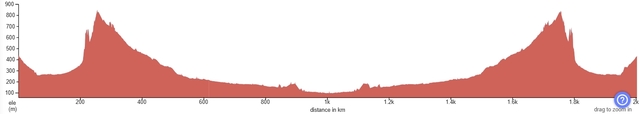 2000kmにもかかわらず、獲得標高は4000m程度とほぼ平坦のルートです。