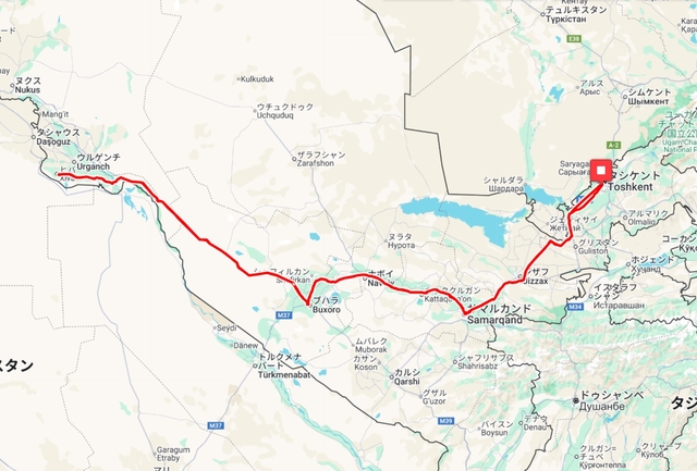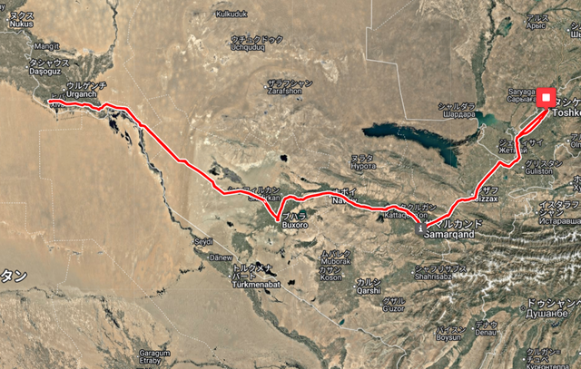 タシケントを出発して、サマルカンドまで約300km、ブハラまで約270km(570km)、ヒヴァまで約430km(1000km)で、往復2000kmになります。 途中にあまり大きな街はなく、3つの街がチェックポイントとなっています。 ブハラとヒヴァ間はキジルクム砂漠という砂漠地帯です。Google Map等で見る限り、街は見当たりません。 この間の430kmをどう攻略するかが肝になりそうです。