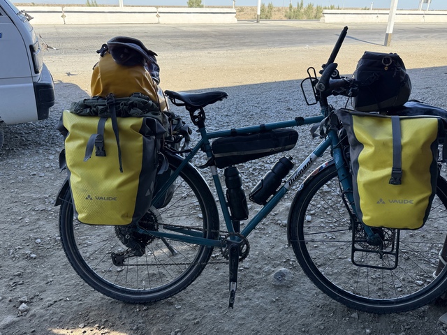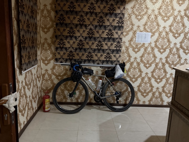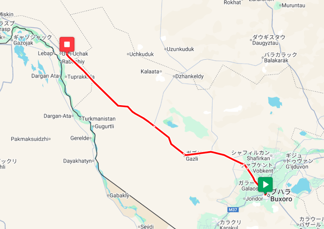 泊まるところですが、Google Mapで事前に840kmあたり(ブハラから263kmくらい)にホテルがあることは確認しました。 ただ、本当に営業しているのか、満室じゃないのかは、行ってみないと分かりません。 もし、泊まれなければ、その先40kmくらいに主催者オススメのレストランがあるので、そこの門を叩くしかないかと思います。 いかんせん、砂漠というものがどういうものなのかもイメージがわかないので、不安がいっぱいですが、走りながら考えようかと思います。