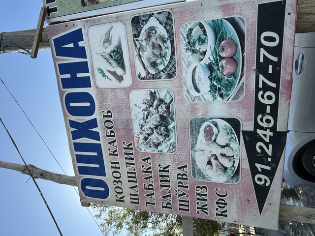 ちなみに、ウズベク語にはアルファベット表記とキリル文字表記があります。 もともとキリル文字が標準だったのが最近はアルファベットで書くようになっているようです。 キリル文字には素養がないので、もはやこうなると看板をみて発音することもできません。