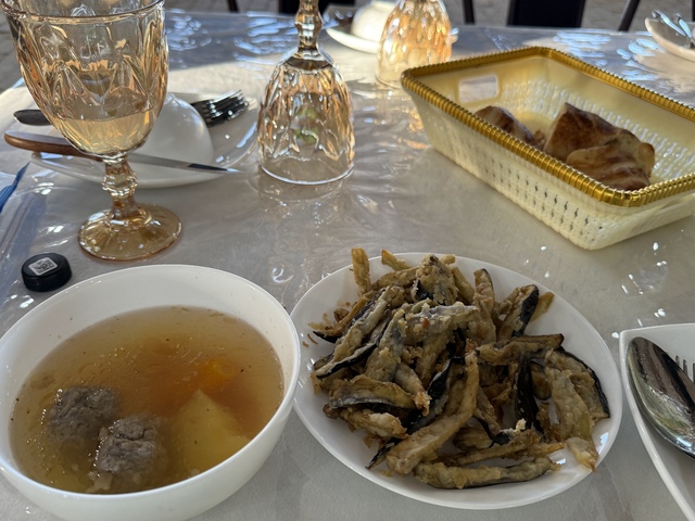 スープとサラダをいただきます。 茄子の天ぷらっぽいものなのですが、サラダと言っていました。