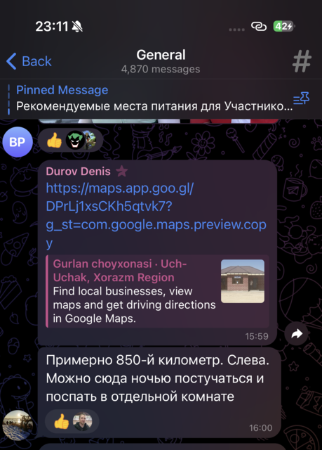 さっそく、Telegramのグループを見てみると、16時頃にDenisさんがちょうどここから10kmくらい先のレストランで夜扉を叩いたら個室で寝られる、と情報を投げてくれていました。