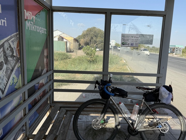 しばらく行くと、バス停が見えてきたので、軽くご飯にします。